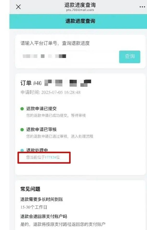 但近日,也有用户根据线上流程申请退款后发现,遭遇卖家保证金不足问题,退货停滞。甚至有网友在晒出的退款进度显示,排队位置在17万之外,预计需15-30个工作日才能到账,“目前退款申请已经通过审核,进入处理流程,当前查询退款进度显示位于177124位。”对于退款退货问题,罗马仕官方微博尚未给出明确回应。