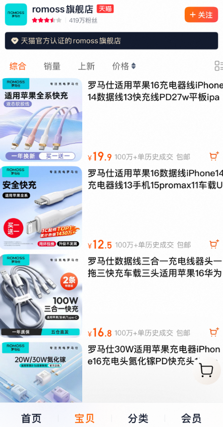 2013年“双11”期间,罗马仕充电宝创下单日超30万销量和2000万元销售额。罗马仕快速发展的优势之一即低价,大容量充电宝售价不足百元,也被称为“价格屠夫”。至2024年,其已连续11年蝉联天猫“双11”移动电源品类销量冠军,年出货量高达5000万件。