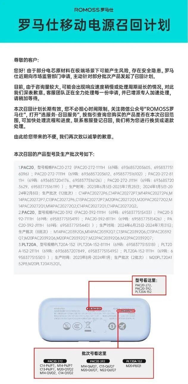 但今年6月,罗马仕因充电时易燃烧、爆炸,被北京多所高校禁用,并登上热搜。紧接着,6月14日,罗马仕官方微博发布《公开声明》致歉,并承诺“任何经权威机构鉴定存在缺陷的罗马仕产品,我们将依法承担全部责任”。6月18日,罗马仕宣布召回计划,称因部分电芯原材料在极端场景下可能产生风险,存在安全隐患,主动召回,并公布召回的产品型号及产品批次。